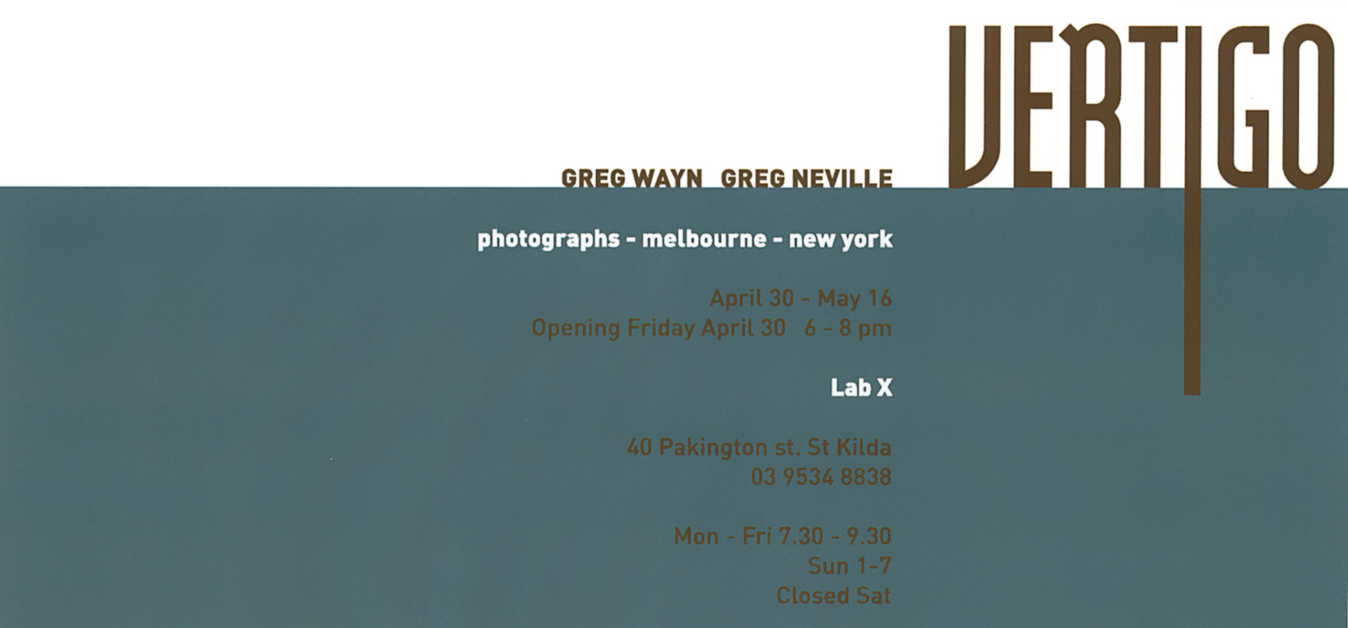 Vertigo was a joint exhibition by Greg Wayn and Greg Neville, held at Lab X Gallery in 2004.